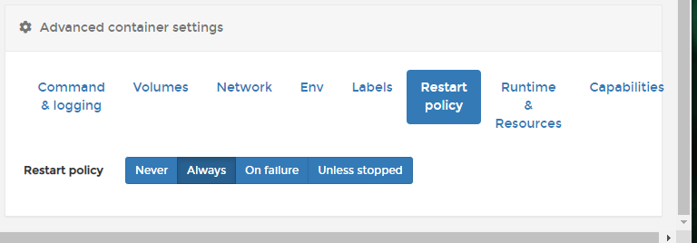 Finally, let's set our Restart policy to Always. This is so that if we ever reboot our server, PiHole will spin back up.